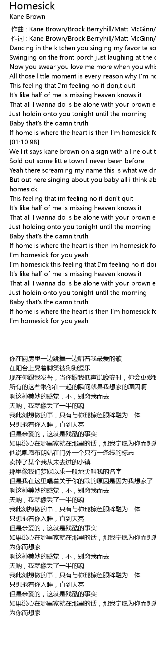 | [01:29.62] | But out here singing about you baby all i think about is how I'm homesick |
