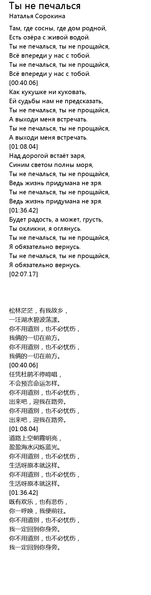 | [01:46.05] | Ты не печалься, ты не прощайся, |
