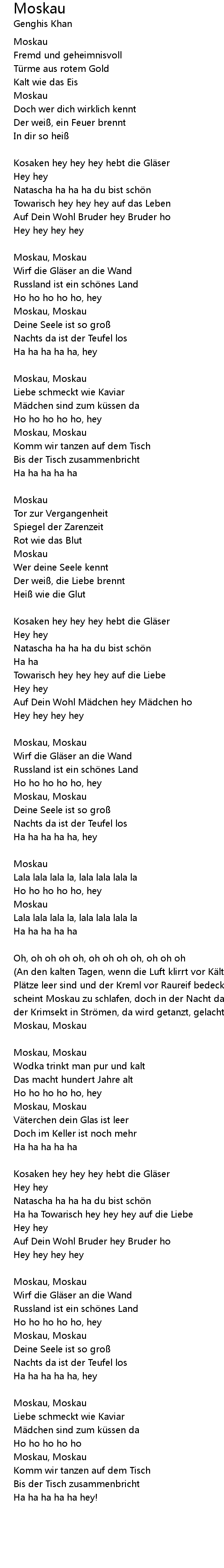 | (An den kalten Tagen, wenn die Luft klirrt vor Kälte und die Straßen und Plätze leer sind und der Kreml vor Raureif bedeckt und das Morgenrot friert, da scheint Moskau zu schlafen, doch in der Nacht da klirren die Gläser, da fliest der Krimsekt in Strömen, da wird getanzt, gelacht und geliebt. Moskau lebt!) | |