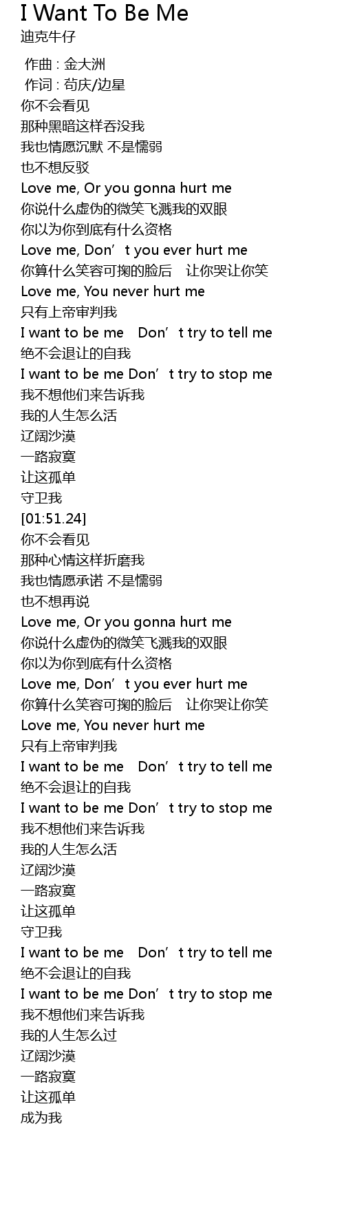 | [03:19.34] | I want to be me Don’t try to tell me |
