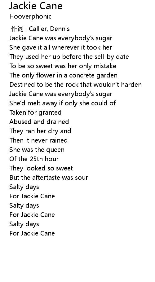 | [00:38.50] | Jackie Cane was everybody's sugar |
