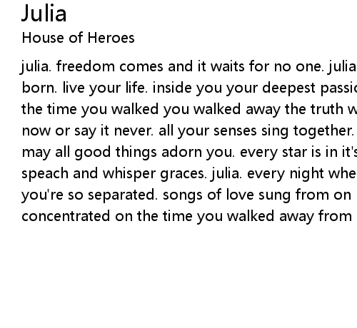 julia. freedom comes and it waits for no one. julia. for this night you were born. live your life. inside you your deepest passions move. they tell you "all the time you walked you walked away the truth was at your fingertips." say it now or say it never. all your senses sing together. julia we're hoping for you. may all good things adorn you. every star is in it's place. they pour forth speach and whisper graces. julia. every night when the sun dies you can feel it. you're so separated. songs of love sung from on high. you can hear them if you concentrated on the time you walked away from love.
