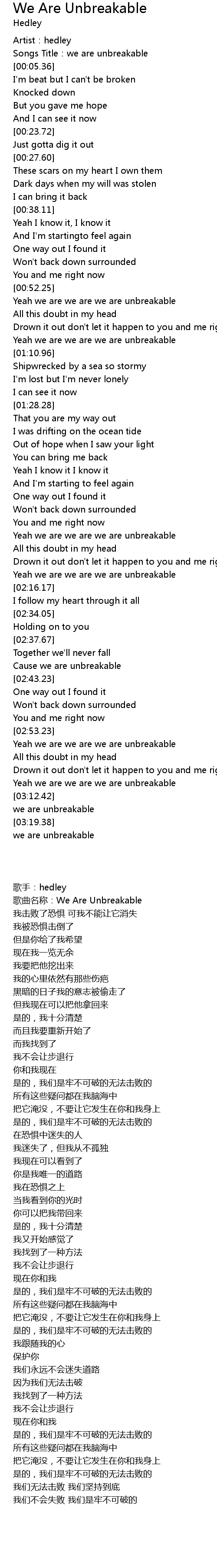 | [00:02.42] | 歌曲名称:We Are Unbreakable |