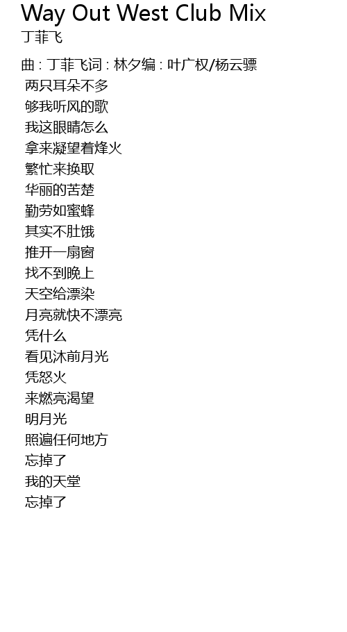 | 曲 : 丁菲飞词 : 林夕编 : 叶广权/杨云骠 | |