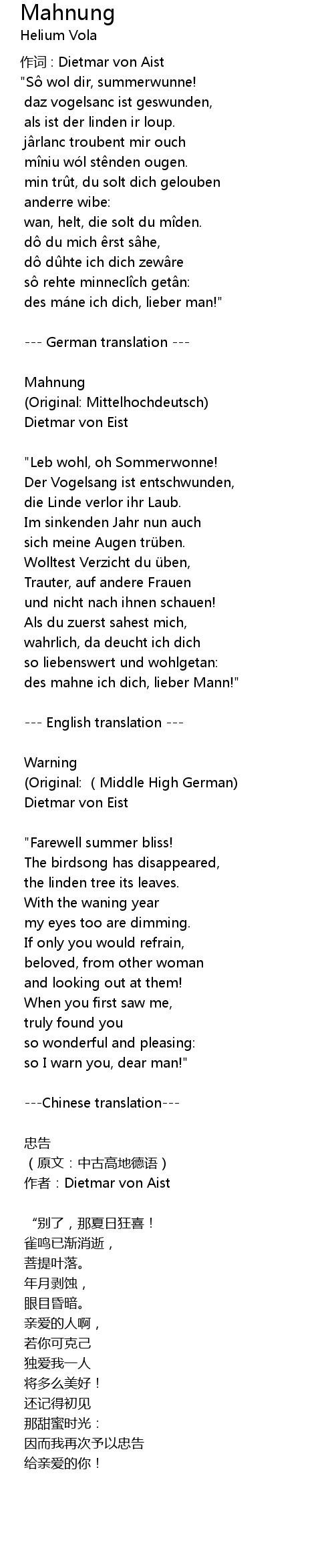 | 作词 : Dietmar von Aist | |