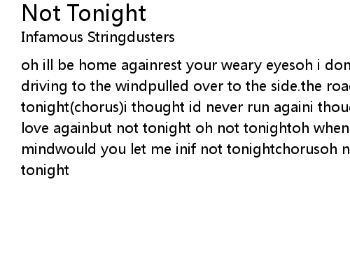 | oh ill be home againrest your weary eyesoh i dont know whenbut not tonightoh driving to the windpulled over to the side.the road is my my friendbut not tonight(chorus)i thought id never run againi though id be alright.i know i will love againbut not tonight oh not tonightoh when tomorrow comesif im on you mindwould you let me inif not tonightchorusoh not tonightnot tonightoh not tonight |