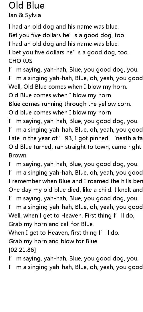 | [02:31.73] | I’m a singing yah-hah, Blue, oh, yeah, you good dog, you. |