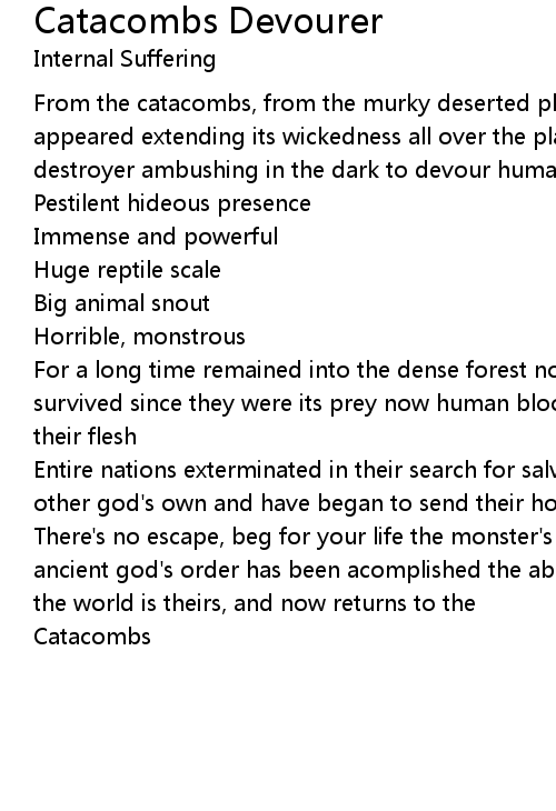 From the catacombs, from the murky deserted place the abominable monstrosity has appeared extending its wickedness all over the planet strange entity, unmercyful destroyer ambushing in the dark to devour humans |