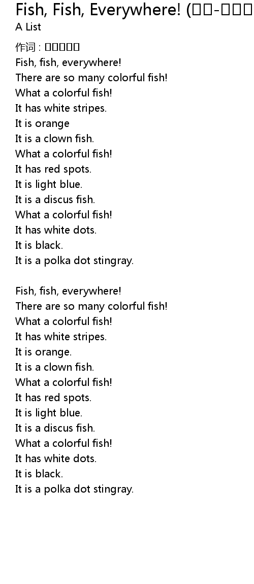 | 歌曲 | Fish, Fish, Everywhere! (챈트-물고기 세상!) |