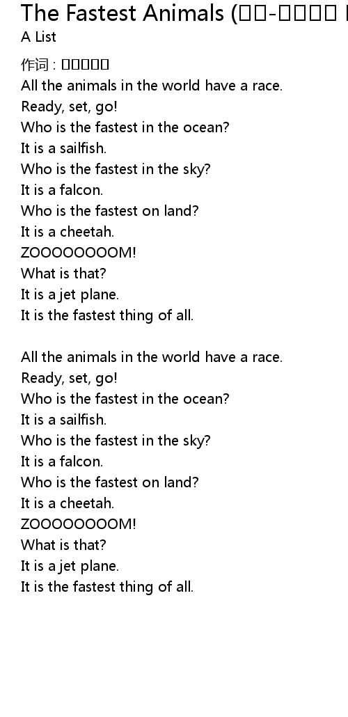| 歌曲 | The Fastest Animals (챈트-세상에서 가장 빠른 것) |