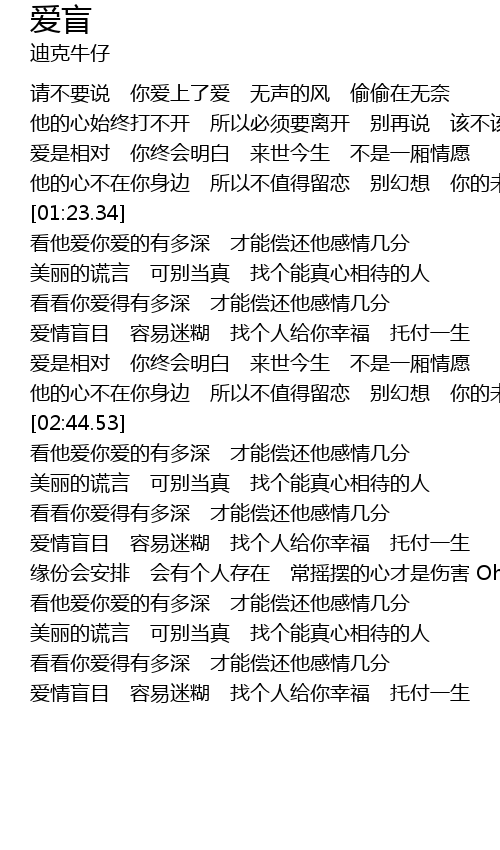 | [01:46.38] | 爱情盲目 容易迷糊 找个人给你幸福 托付一生 |