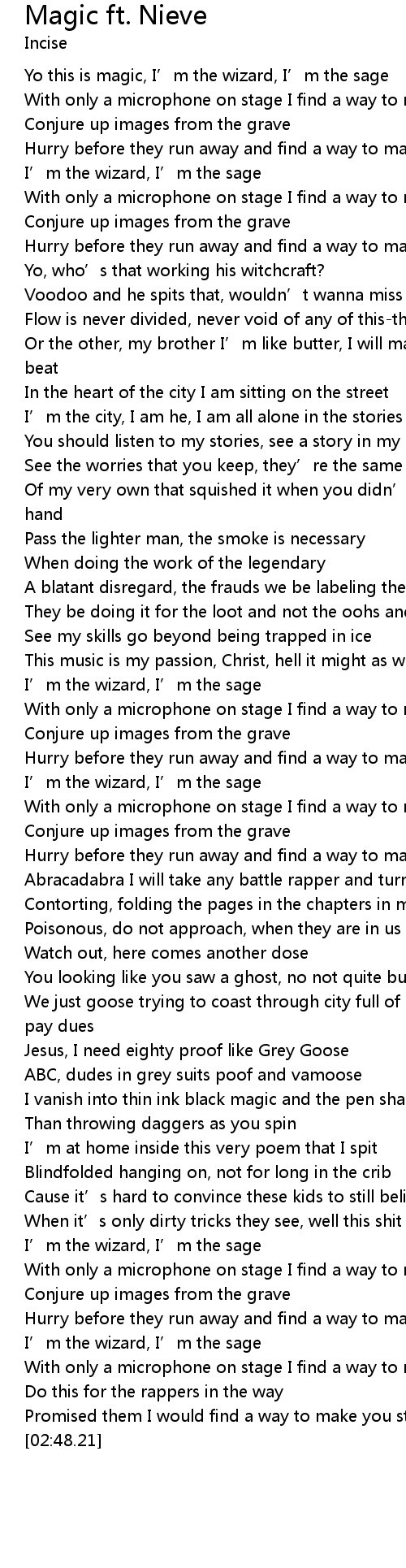 | [00:10.61] | Yo this is magic, I’m the wizard, I’m the sage |