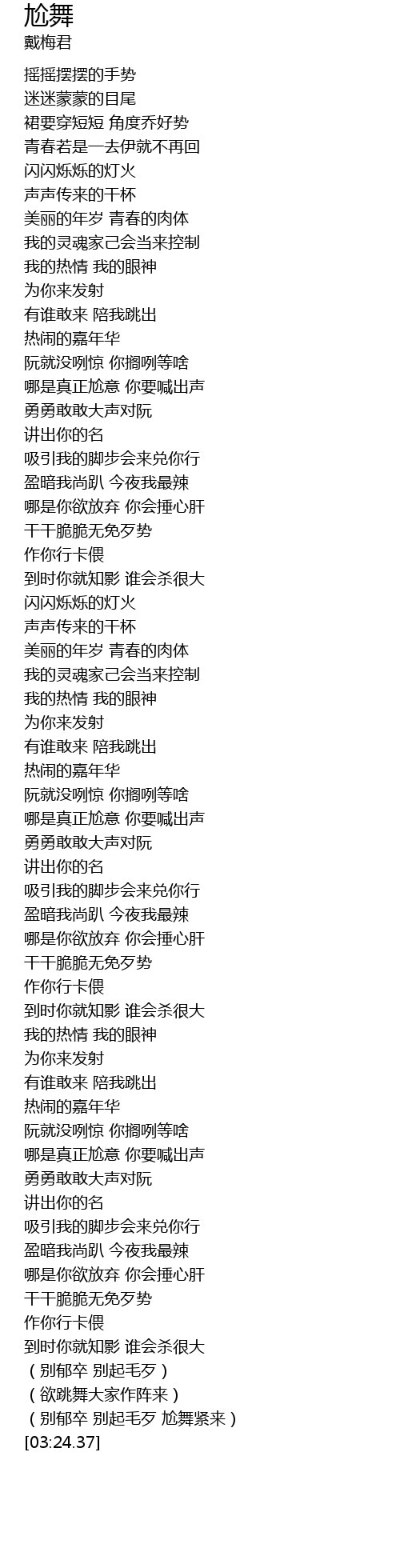 | [03:21.61] | (别郁卒 别起毛歹 尬舞紧来) |