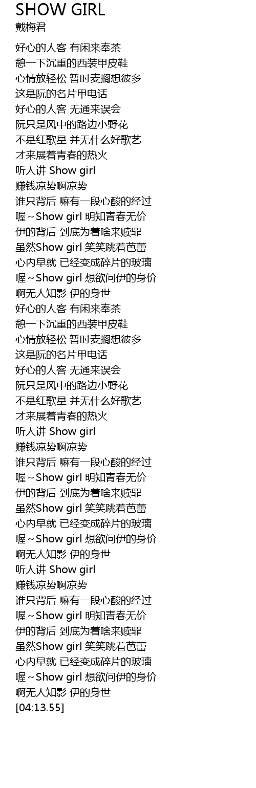 | [04:04.81] | 喔~Show girl 想欲问伊的身价 |