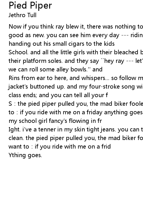| Ight. i' ve a tenner in my skin tight jeans. you can touch it if your hands are clean. the pied piper pulled you, the mad biker folled you, i' ll do what you want to: if you ride with me on a frid | |