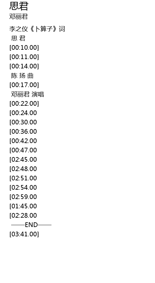 | [03:18.00][01:45.00] | 邓丽君:《思君》 |