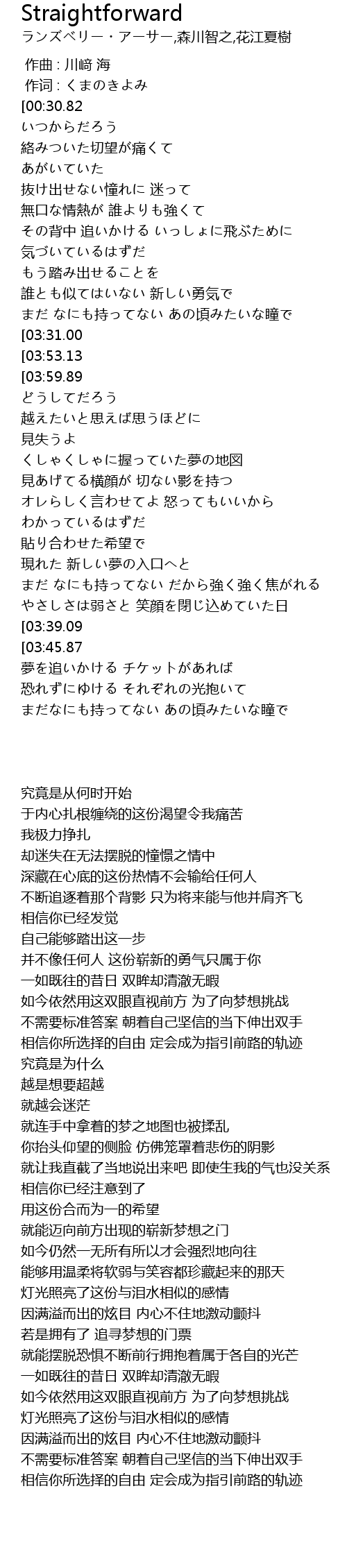 | [01:14.31][03:53.13] | 正解はいらない 信じた今に手をのばす |
