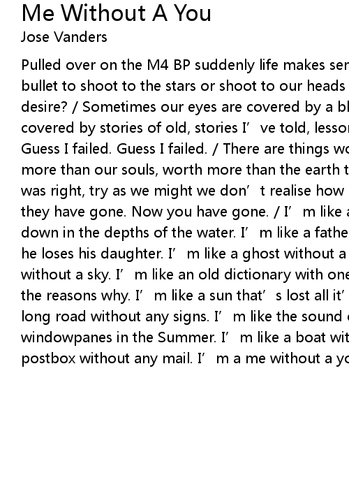 | Pulled over on the M4 BP suddenly life makes sense to me. We all get one single bullet to shoot to the stars or shoot to our heads if we desire what do you desire? Sometimes our eyes are covered by a blindfold. This time my heart was covered by stories of old, stories I' ve told, lessons I thought I had learnt. Guess I failed. Guess I failed. There are things worth more than gold, worth more than our souls, worth more than the earth that we tread upon. Guess Joni was right, try as we might we don' t realise how good those things are ' til they have gone. Now you have gone. I' m like a pirate that loses his treasure down in the depths of the water. I' m like a father who loses his mind, after he loses his daughter. I' m like a ghost without a home. I' m like a plane without a sky. I' m like an old dictionary with one word too many explaining the reasons why. I' m like a sun that' s lost all it' s shine. I' m like a long road without any signs. I' m like the sound of the rain against windowpanes in the Summer. I' m like a boat without any sails. I' m like a postbox without any mail. I' m a me without a you. |