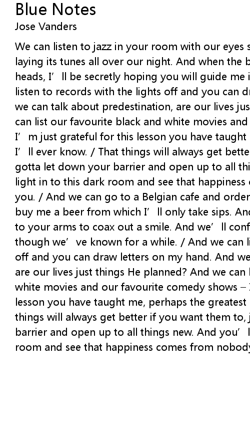 | We can listen to jazz in your room with our eyes shut tight. Hear the saxophone laying its tunes all over our night. And when the blue notes slide all over our heads, I' ll be secretly hoping you will guide me into your bed. And we can listen to records with the lights off and you can draw letters on my hand. And we can talk about predestination, are our lives just things He planned? And we can list our favourite black and white movies and our favourite comedy shows I' m just grateful for this lesson you have taught me, perhaps the greatest one I' ll ever know. That things will always get better if you want them to, just gotta let down your barrier and open up to all things new. And you' ll let light in to this dark room and see that happiness comes from nobody else but you. And we can go to a Belgian cafe and order mussels and chips. And you will buy me a beer from which I' ll only take sips. And I' ll compare the seafood to your arms to coax out a smile. And we' ll confess our interest in each other though we' ve known for a while. And we can listen to records with the lights off and you can draw letters on my hand. And we can talk about predestination, are our lives just things He planned? And we can list our favourite black and white movies and our favourite comedy shows I' m just grateful for this lesson you have taught me, perhaps the greatest one I' ll ever know. That things will always get better if you want them to, just gotta let down your barrier and open up to all things new. And you' ll let light in to this dark room and see that happiness comes from nobody else but you. |