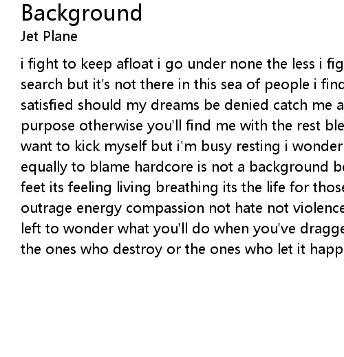 i fight to keep afloat i go under none the less i fight for a breath of air search but it's not there in this sea of people i find i am not an equal i'm not satisfied should my dreams be denied catch me at a good time see a man with a purpose otherwise you'll find me with the rest blending into the background i want to kick myself but i'm busy resting i wonder why i complain when i'm equally to blame hardcore is not a background beat for you to move your dancing feet its feeling living breathing its the life for those who love living its outrage energy compassion not hate not violence or fashion so i ask you and i'm left to wonder what you'll do when you've dragged it under find who's to blame the ones who destroy or the ones who let it happen