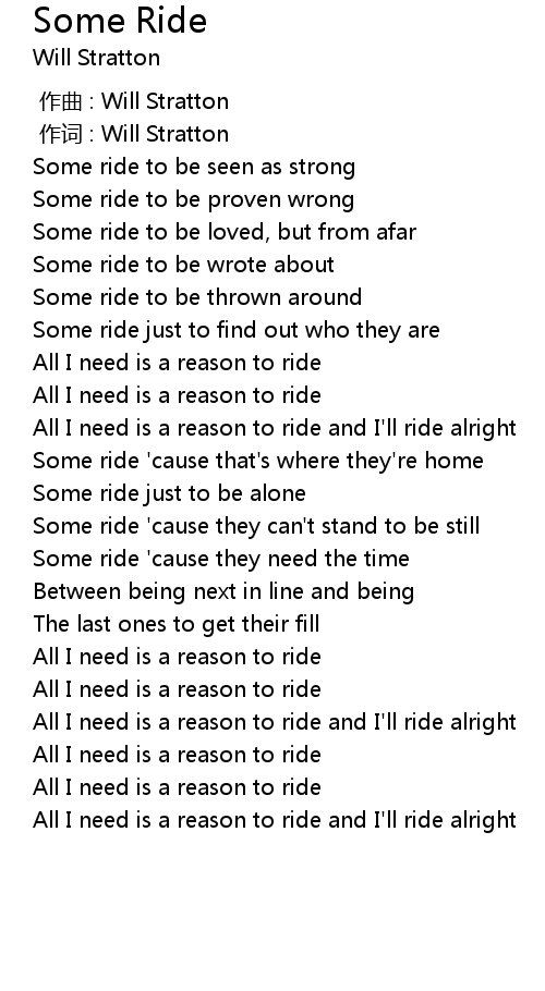 | [02:27.79] | All I need is a reason to ride and I'll ride alright |