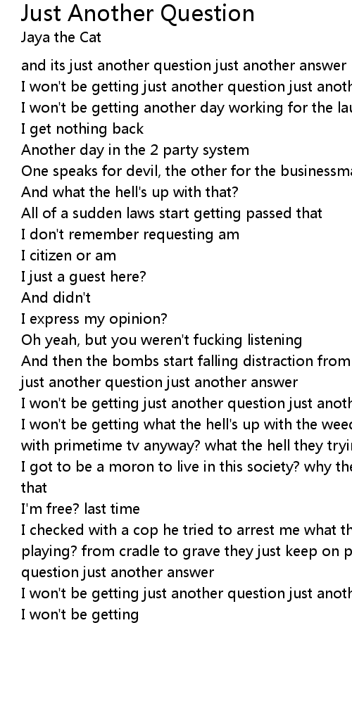 I checked with a cop he tried to arrest me what the hell game kind of game they playing? from cradle to grave they just keep on playing its just another question just another answer |