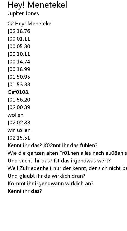 | [01:10.20][00:10.11] | Und wollt ihr das? K02nnt ihr das sehen? |