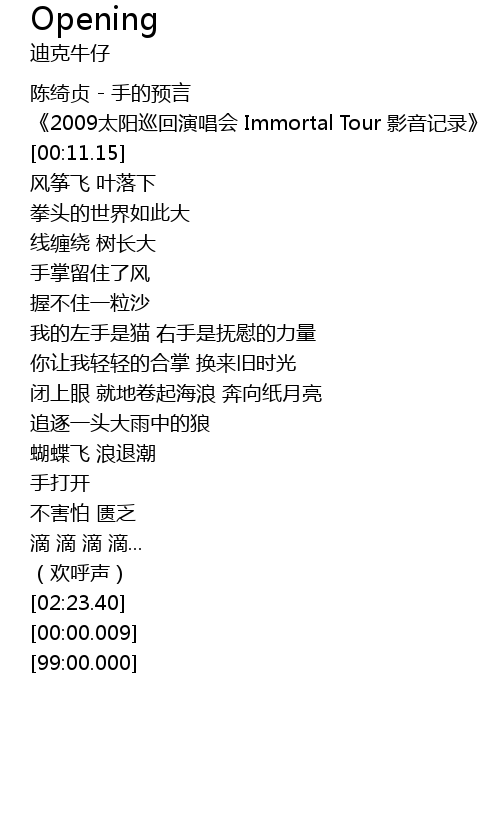| [00:00.010] | 陈绮贞 - 手的预言 |