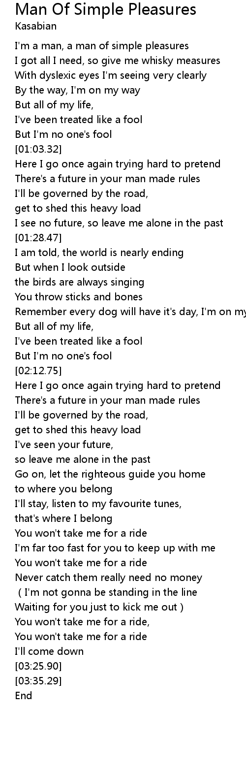| [00:27.05] | I' m a man, a man of simple pleasures |