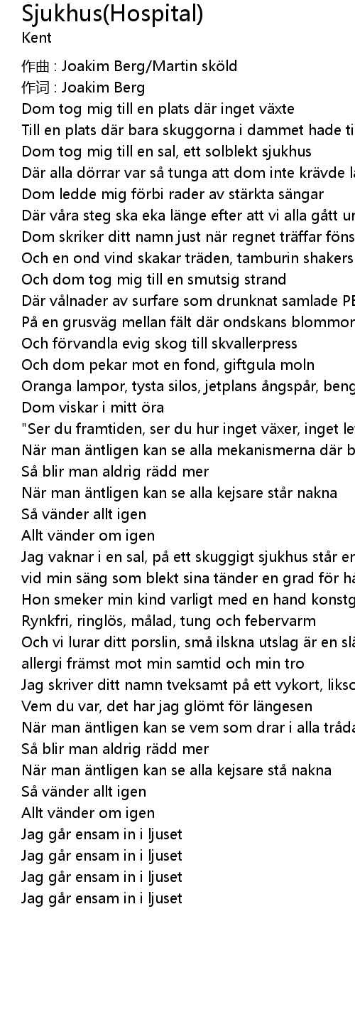 | Dom tog mig till en sal, ett solblekt sjukhus | |