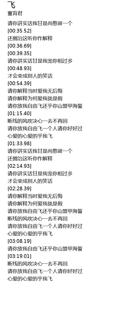| [03:12.25] | 请你放我自由飞还乎你山盟甲海誓 |