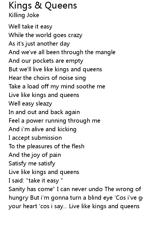 Sanity has come" I can never undo The wrong of the beginning There's so many hungry But i'm gonna turn a blind eye 'Cos i've got to live now Rejoice and kill your heart 'cos i say... Live like kings and queens