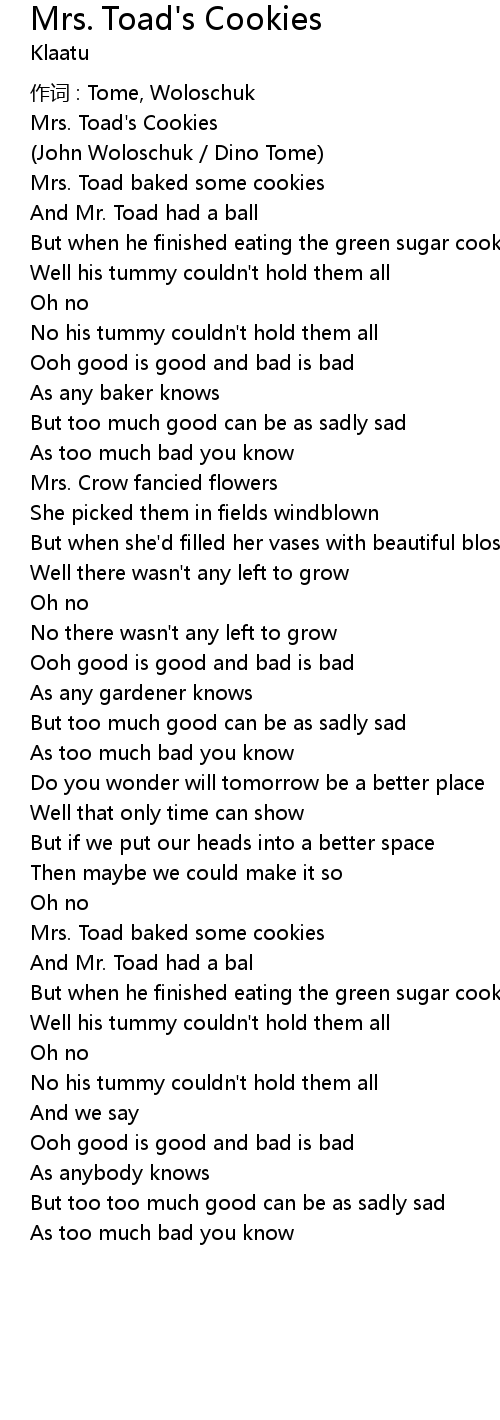 | 歌曲 | Mrs. Toad's Cookies |