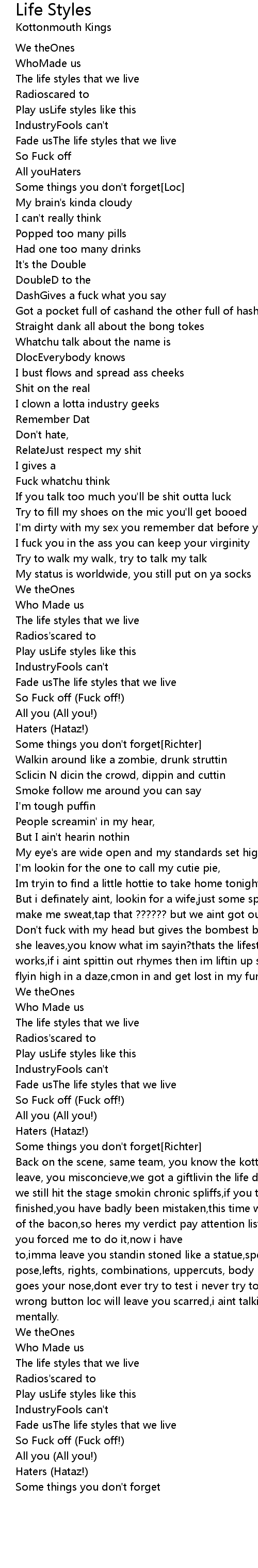 Back on the scene, same team, you know the kottonmouth kingsreign supreme us leave, you misconcieve,we got a giftlivin the life doin the things you wish,and we still hit the stage smokin chronic spliffs,if you thought we were finished,you have badly been mistaken,this time were takin overbringin home all of the bacon,so heres my verdict pay attention listen closely,theres no one in the world who can fuckin out smoke me,[Loc]you forced me to do it,now i have to,imma leave you standin stoned like a statue,speechless, as i let loose a pose,lefts, rights, combinations, uppercuts, body blows,body blow, elbow there goes your nose,dont ever try to test i never try to rap hardbut if you push a wrong button loc will leave you scarred,i aint talkin physically im penetratin mentally.