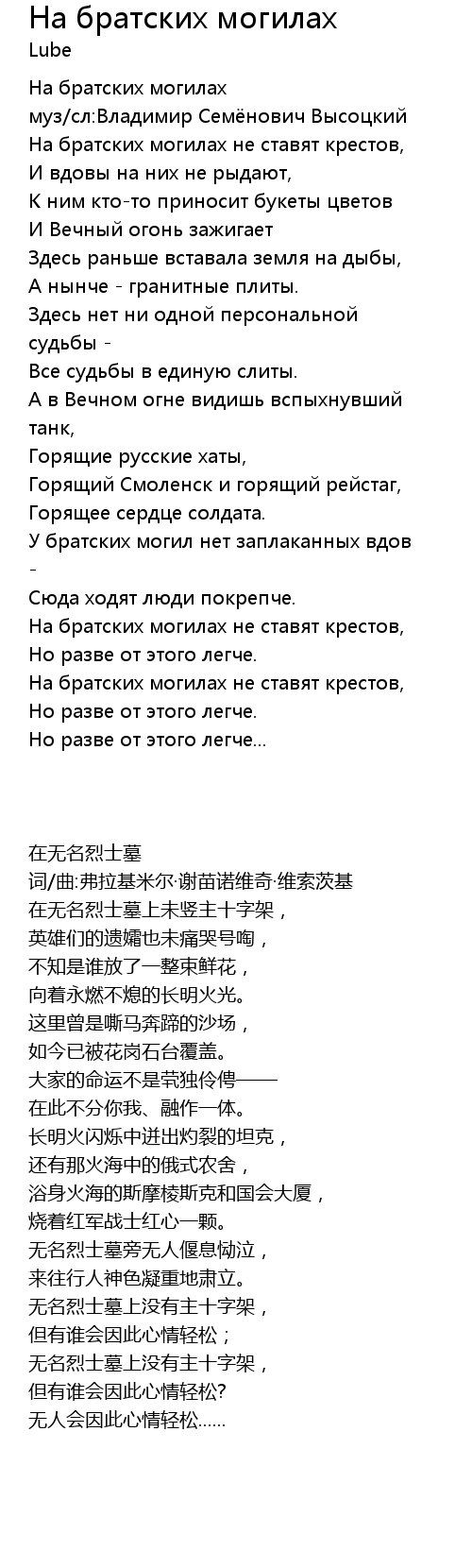 | [01:45.92] | На братских могилах не ставят крестов, |
