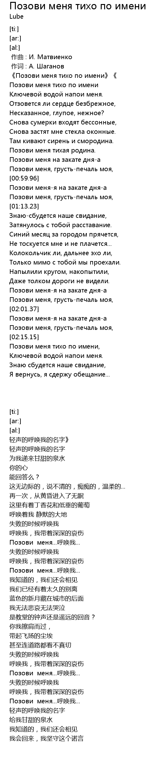 | 歌曲 | Позови меня тихо по имени |