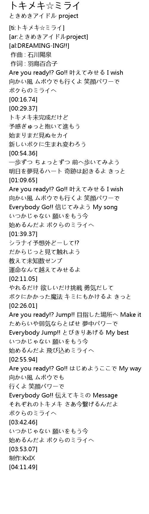 | [03:33.76] | それぞれのトキメキ さあ今繋げるんだよ ボクらのミライへ |