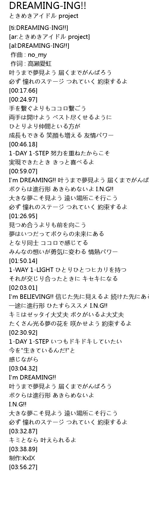 | [00:59.27] | I'm DREAMING!! 叶うまで夢見よう 届くまでがんばろう |