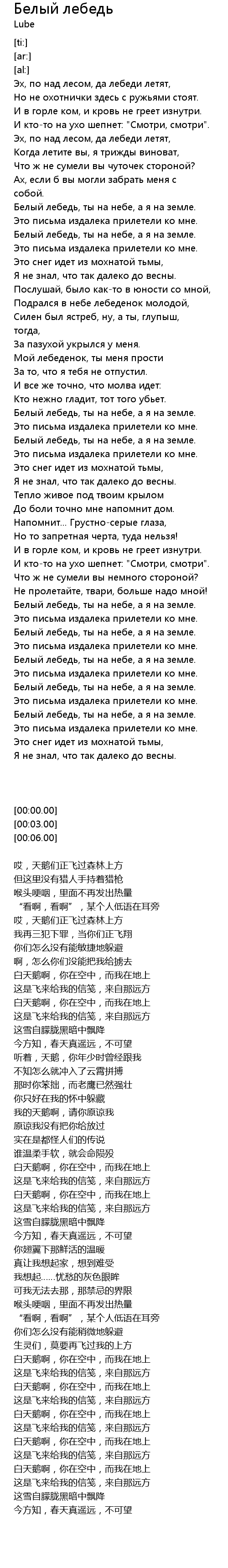 | [03:50.60] | Белый лебедь, ты на небе, а я на земле. |