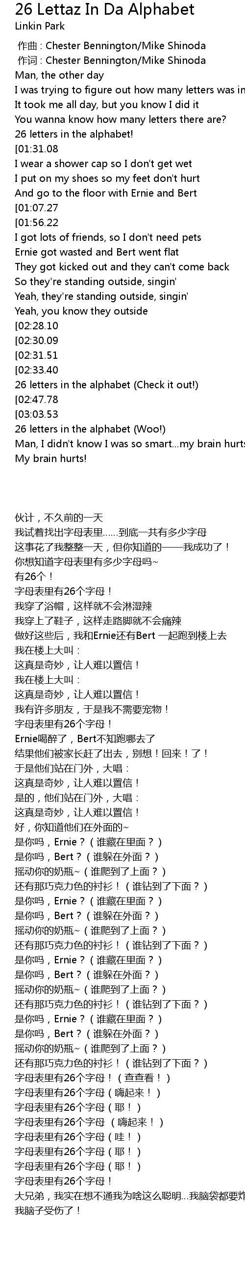| [02:55.86][02:47.78] | 26 letters in the alphabet (Here we go!) |