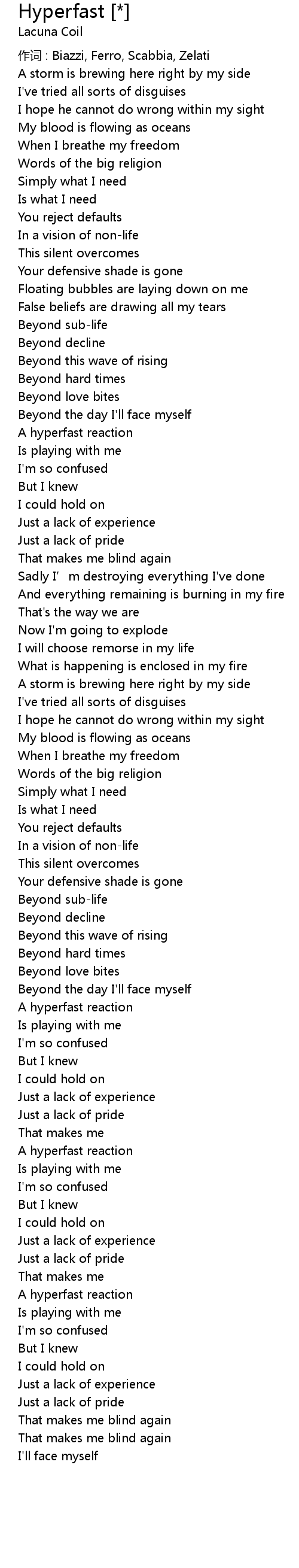 | 作词 : Biazzi, Ferro, Scabbia, Zelati | |