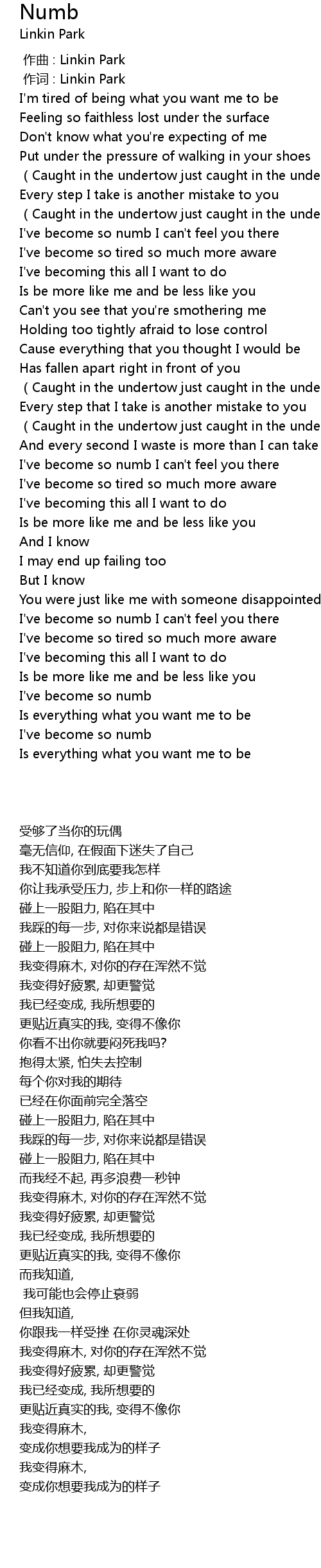 | [00:50.480] | I' ve become so numb I can' t feel you there |