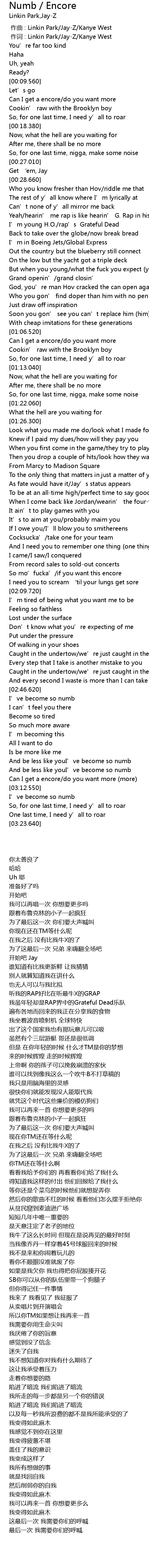 | [00:01.00] | zuò cí : Linkin Park JayZ Kanye West |