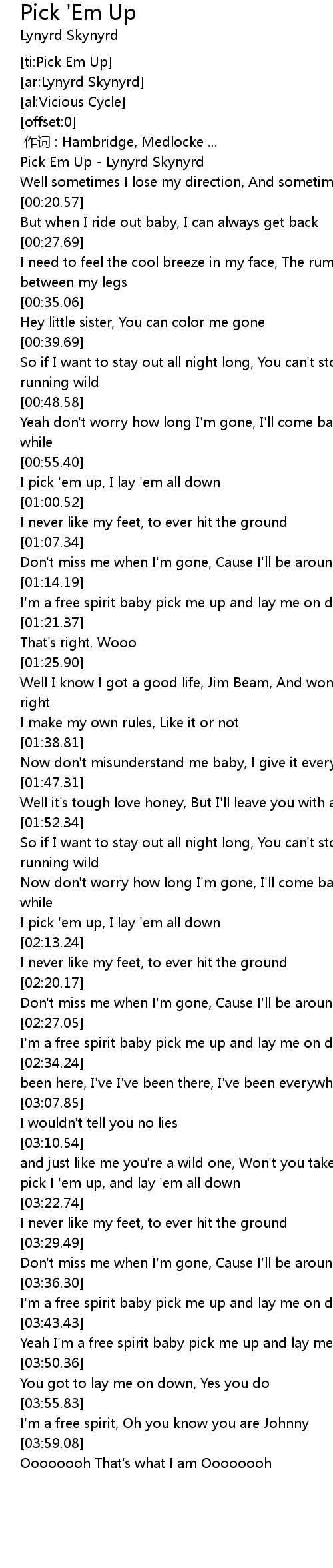 | [00:01.01] | Pick Em Up Lynyrd Skynyrd |