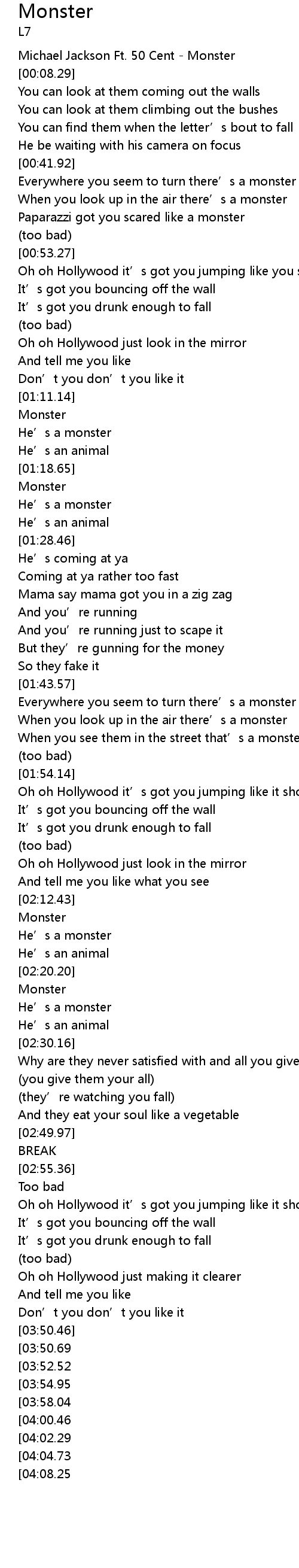 | [00:03.72] | Michael Jackson Ft. 50 Cent Monster |