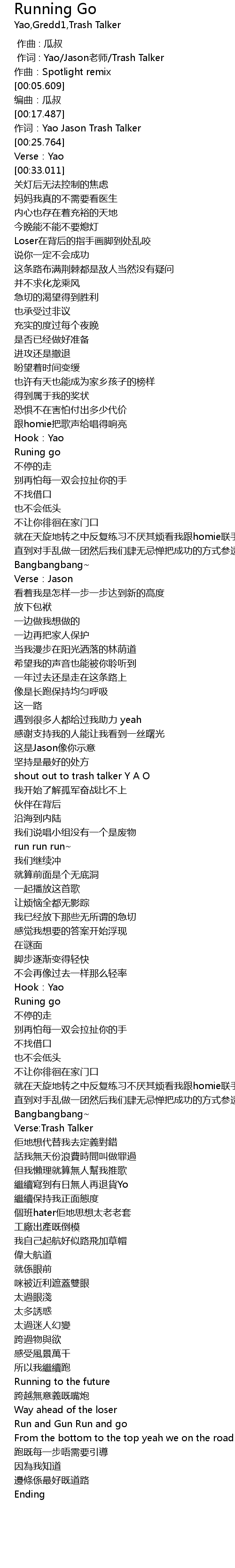 | [00:00.511] | 作词 : Yao/Jason老师/Trash Talker |