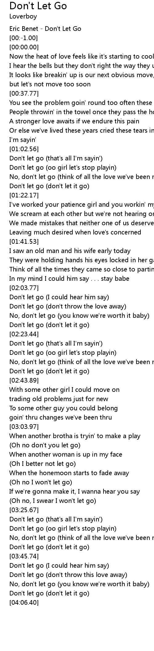| [02:08.14] | Don't let go (don't throw the love away) |