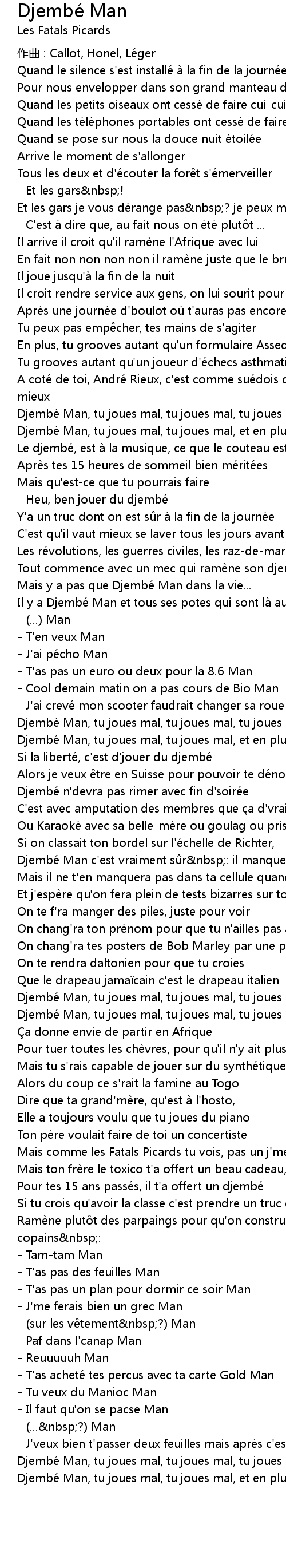 | Djembe Man, tu joues mal, tu joues mal, et en plus tu joues fort | |