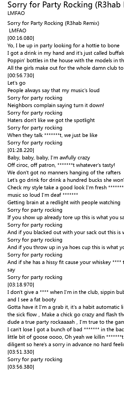 | [03:22.990] | Gotta have it I'm a grab it, it's a habit automatic like uzi, with the sick flow,Make a chick go crazy and flash them ta-ta's it's redfoo the dude a true party rockaaaah,I'm true to the game too, it's called beerpong and I can't lose I got a bunch of bad ******* in the back,With ciroc on tap and a little bit of goose oooo, Oh yeah we killin *******t with our money,We diligent so here's a sorry in advance no hard feelings ******* |