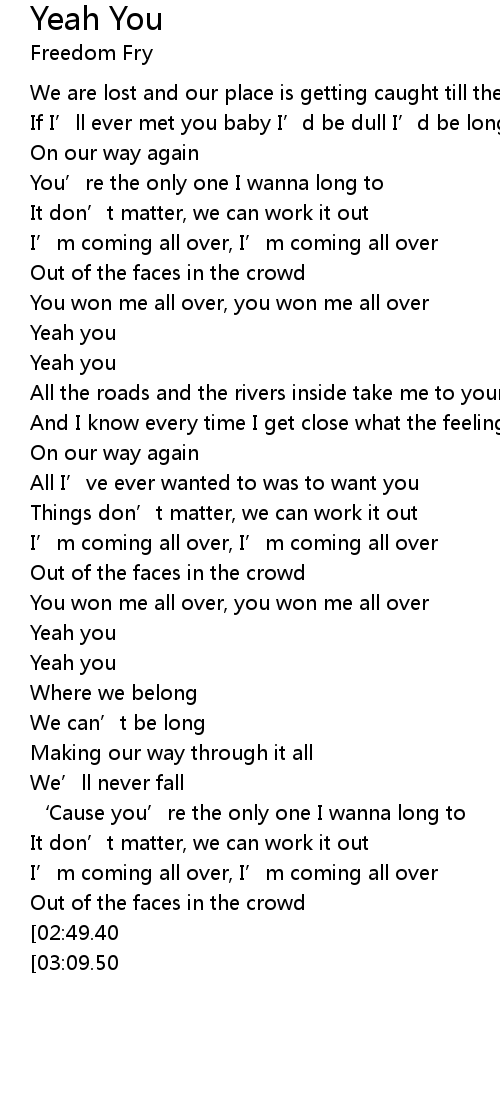 | [03:02.80][03:09.50][03:15.80][03:22.00] | Yeah you |